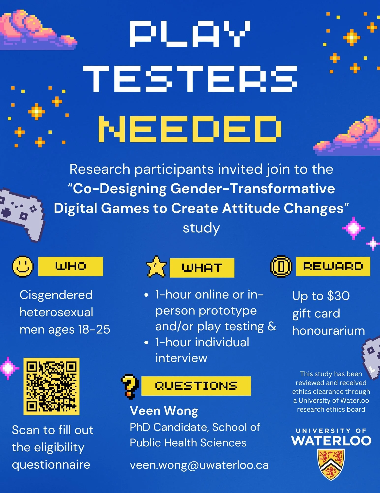 This study explores how digital games can be designed to shift harmful social and gender norms related to intimate partner violence (IPV). Participants will take part in co-design and playtesting sessions to provide feedback on a prototype game created using a gender-transformative approach. Participants’ input will help refine the game’s design, ensuring it resonates with young men and effectively promotes healthy, equitable relationships.